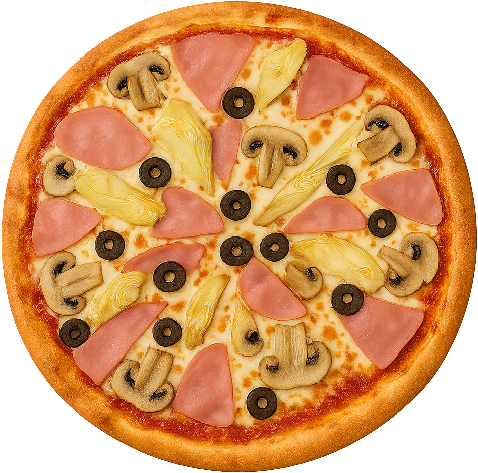 sos pomidorowy, mozzarella, szynka, pieczarki, oliwki, karczochy